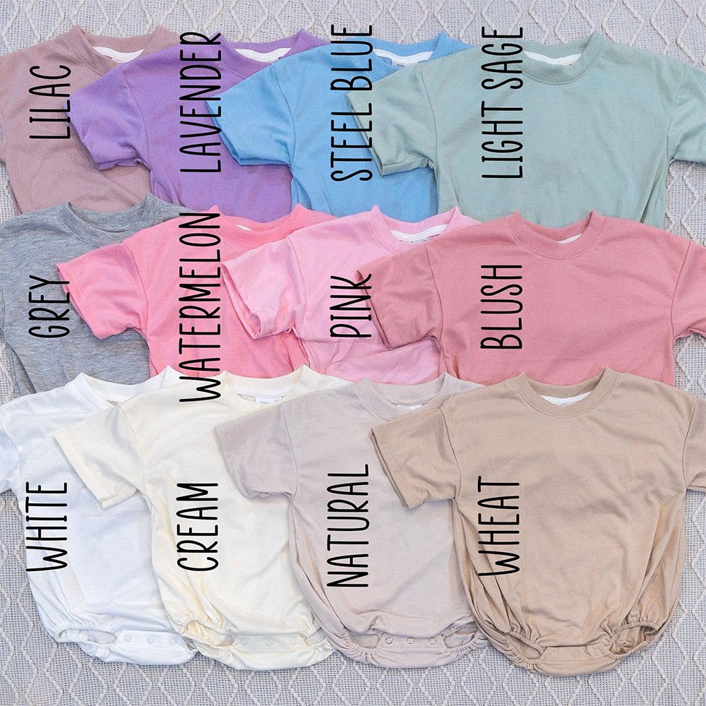 All blanks are manufactured in a sweatshop free warehouse and are made of 100% polyester. They offer the luxurious feel of soft cotton and boast an oversized, stretchy fit, ensuring durability and comfort. Designs are then added by me through sublimation ink. It's important to mention that sublimation ink does not include white, so any white elements in designs will take on the color of the chosen romper or tee.